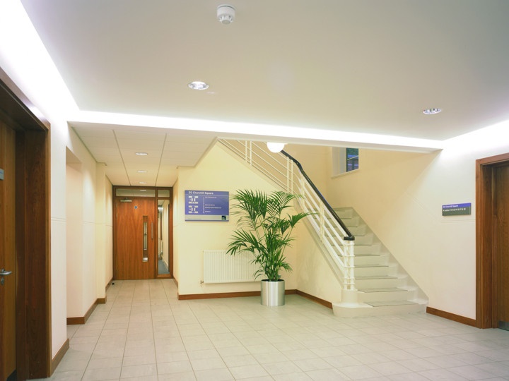 Electrical services consisted of sub main distribution providing an individual electricity service to each tenant’s accommodation, lighting using modular fluorescent luminaires to CIBSE LG3 requirements, small power to each tenancy distributed via a skirting trunking system, automatic fire detection throughout and an audio door entry system.