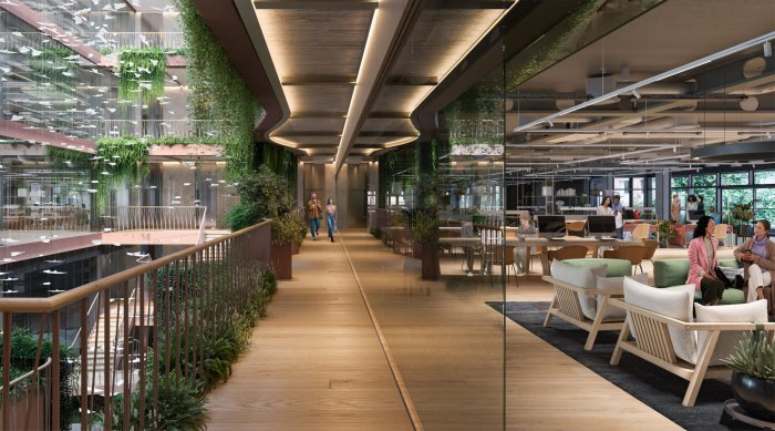 Including community space, collaborative neighbourhood uses, a rooftop restaurant, bar, swimming pool + terraces, the building creates a new benchmark in greening, biodiversity and sustainability by providing space for nature, not just humans.