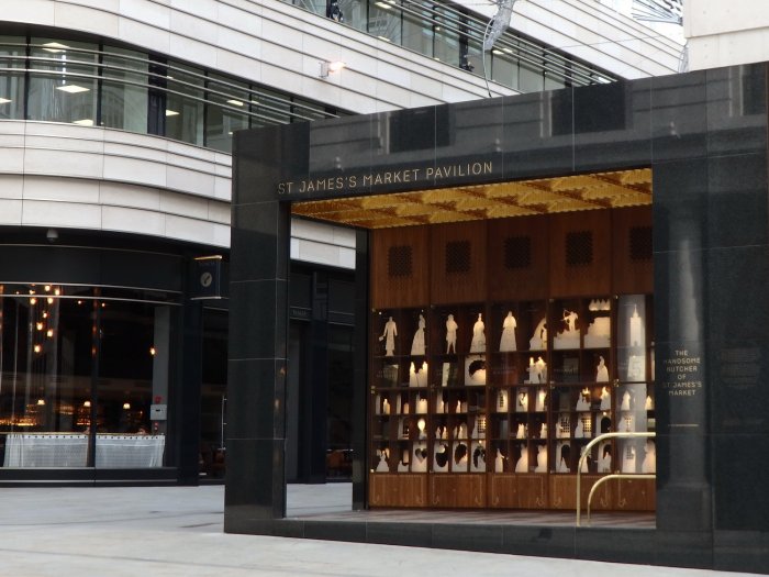 - a heavy golden shutter hidden in the bulkhead draws down at night, leaving the contents of the pavilion visible round the clock
